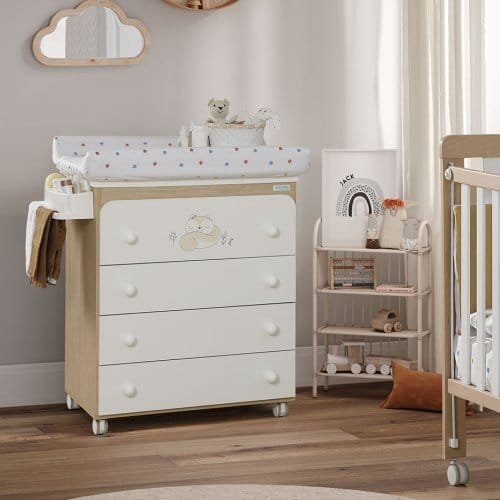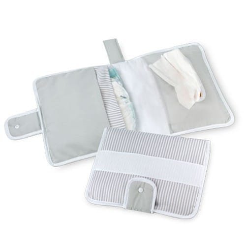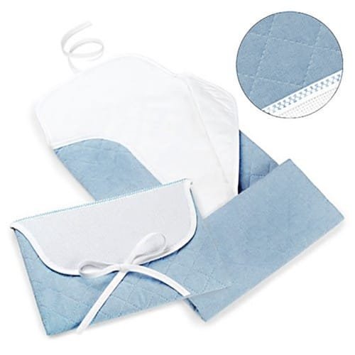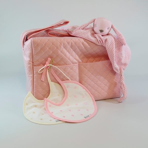 Cambiador rosa, beige, azul y blanco con cinta de raso
